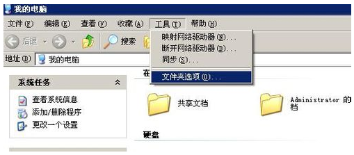 2、在“工具”下拉菜单中点击“文件夹选项”,打开“文件夹选项”窗口。