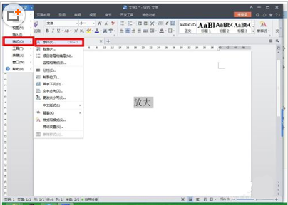 3、我们还可以选中需要放大的字体,然后在左上角“wps文字”处,点击后面的折叠符号,展开菜单里选择“格式”命令,在子菜单中选择“字体”,点击进入“字体”把持面板,找到“字号”栏,点击输入框,在里面手动输入我们需要将字体放大的数值,输入后,点击下方的“断定”就可以了。