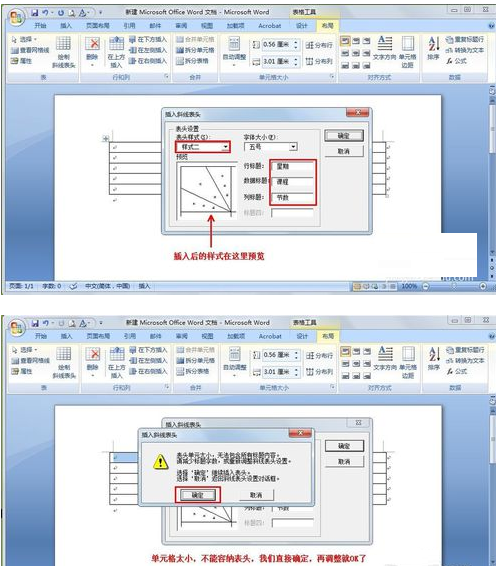 4、在插入斜线表头的对话框中选择表头样式,在右边输入相应的标题。比如做课程表的斜线表头就可以如图输入,点击断定之后弹出对话框直接再点断定就行了。