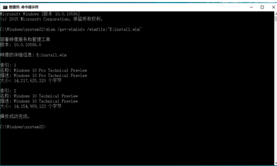 2、打开命令提示符(管理员)输入以下命令以解压install.wim文件:dism /get-wiminfo /wimfile:"E:install.wim"如下图,我的系统是WIN10专业版,即选择1,普通版选择2,具体命令在下面。