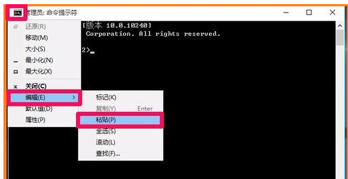 2、复制:for %1 in (%windir%\system32\*.dll) do regsvr32.exe /s %1 命令,在打开的管理员命令提示符窗口,点击左上角的小框,在下拉菜单中点击编辑 - 粘贴;