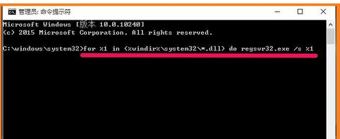 3、我们点击:编辑 - 粘贴以后,for %1 in (%windir%\system32\*.dll) do regsvr32.exe /s %1 命令就复制到了管理员命令提示符窗口中(这样操作,输入的命令不会涌现毛病),按下键盘上的回车键;