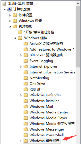2、在组策略左侧,依次打开盘算机配置,管理模板,windows组件,windows毛病报告