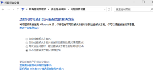5、此时可查看windows毛病报告设置为关闭状态,选中“从不检查解决方案”即可关闭Win10毛病报告了。
