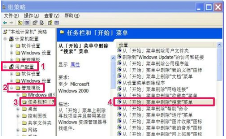 2、进入组策略窗口,按“用户配置”->“管理模板”->“任务栏和[开端]菜单”此路径,找到右侧的“从[开端]菜单中删除“搜索”菜单”这一项,双击。