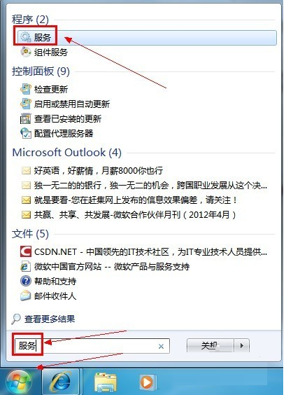 1、单击“开端”按钮,在“搜索程序和文件”框中键入“服务”,出来的程序列表单击“服务”项