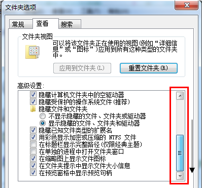 4、然后拖动进度条到最下端,找到“暗藏一直文件的扩大名”这一项, 取消勾选。记得点击保存设置,这样就可以看到文件夹后缀名了。补充:在这个菜单中,还可以进行其他关于文件夹选项的设置。