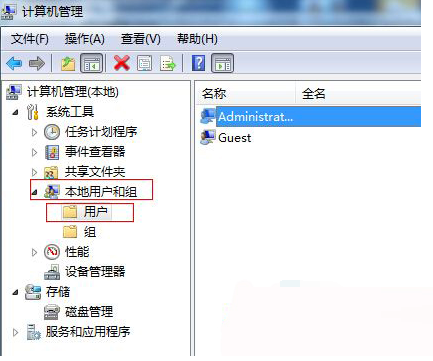 2、在打开的管理界面中,依次展开左侧的“本地用户和组-用户”项;