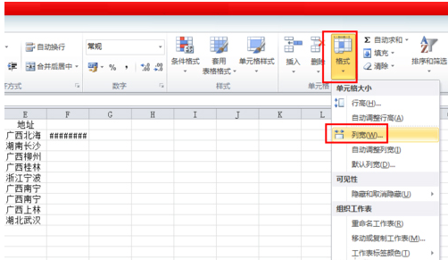 1、调剂列宽。利用鼠标把整列列宽像右拖动,或者利用单元格“格式”功效下的“列宽”调剂列宽;如下图所示: