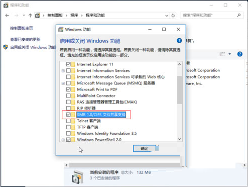 4、确保选中“SMB1.0/CIFS文件共享支撑”,然后重新启动电脑即可生效;