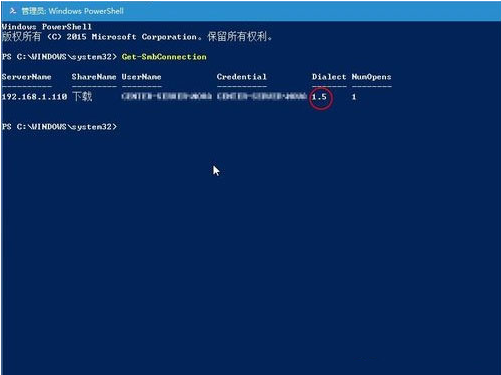 6、可以通过在powershell命令行输入Get-SmbConnection命令查看当前的samba共享连接情况,创造这个NAS应用的SMB协议版本是1.5。