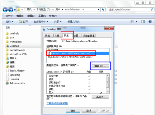 3、在上的选项卡中点击“安全”,打开安全页面,之后选择Administrator,之后点击下面的“编辑”