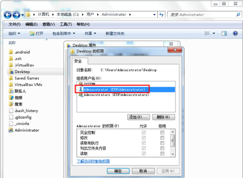 4、点击“编辑”后,打开如下图所示的Desktop的权限设置对话框,同样在组或用户名列表中选择Administrator