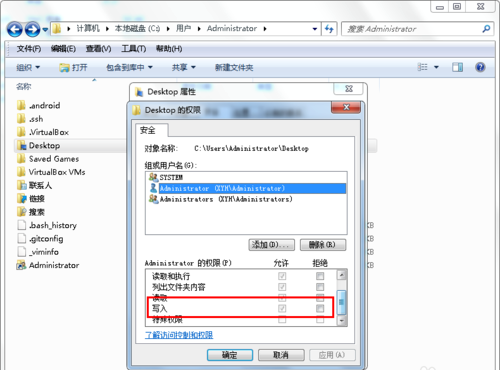 5、在Administrator的权限列表下面拖动右边的下拉滚动条,找到“写入”,如下图所示