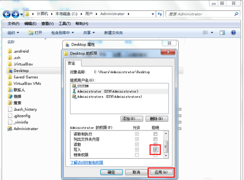 6、勾选写入的“拒绝”权限,然后点击右下方的利用按钮,如下图所示