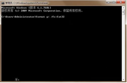 2、然后在打开的命令窗口输入“format g: /fs:fat32”(g是U盘的磁盘盘符),接着按下回车键;