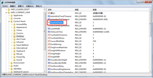 4、在涌现的子菜单中,进入Desktop,双击右侧页面中的“AutoEndTasks”,在文本框内输入1即可(有些电脑本身就是设置为1,那便不需要修正了,一般电脑设置默认值为0 )