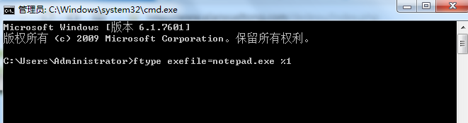 2.输入ftype exefile=notepad.exe %1,这句话的意思是将所有的EXE文件用“记事本”打开。这样本来的病毒就无法启动了。