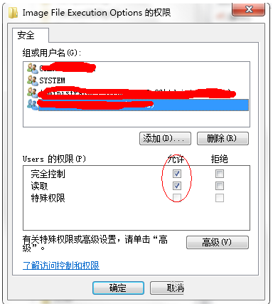 4、选择你应用的组或用户名 将完整把持权限 勾选为容许
