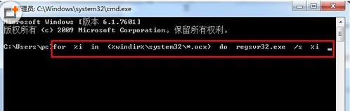2、注册DLL文件方法:运行——>cmd——>输入for %1 in (%windir%\system32\*.dll) do regsvr32.exe /s %1