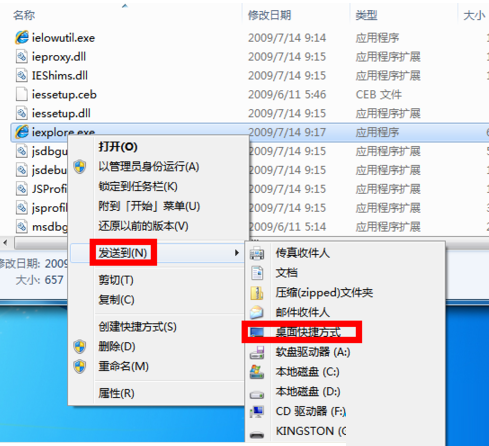 2、找到iexplore,右键点击,选择“发送到”----“桌面快捷方法”;