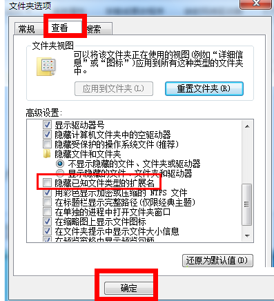 2、涌现“文件夹选项”界面,点击上面的“查看”,将“暗藏已知文件类型的扩大名”前面的对号去掉,点击断定;