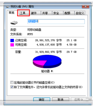 2、弹出“我的u盘属性”选项卡,在这个选项卡中,点击上方的“工具”,打开属性中的修复工具界面。进入“工具”,在最上方的选项栏目“查错”中,点击“开端检测(C)”。