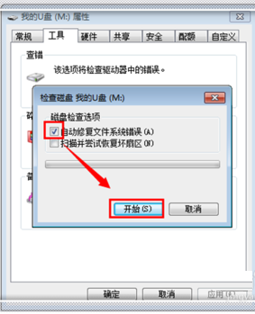 3、弹出“检查磁盘-我的U盘”选项卡,在磁盘检查选项下,勾上“主动修复文件系统毛病(A)”,然后点击“开端(S)”。