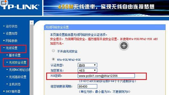 2、进入路由器设置界面,依次展开左侧的 无线设置 -> 无线安全设置 ,然后右侧的PSK密码,就是路由器的Wifi密码,修正这个密码即可,建议尽量包含字母+字符+数字组合,长度在10-15位之间,这样可以有效防止一些破解软件,如图。