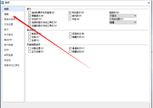 4、在打开的WPS选项对话窗口中,将选项卡切换到“编辑”选项卡栏。如图所示;