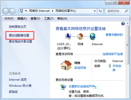 2、然后点击更改适配器设置;