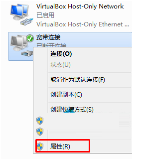 3、打开后,右键点击“宽带连接”选择属性;