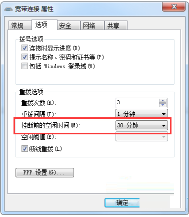 4、打开属性后,我们切换到“选项”,然后在“挂断前的空闲时间”后面选择一个空闲等候时间,具体可以根据用户实际需要来设置主动断开时间。