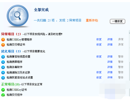 7、之后点击一键修复即可完成了,再点击交行链接即可完成。