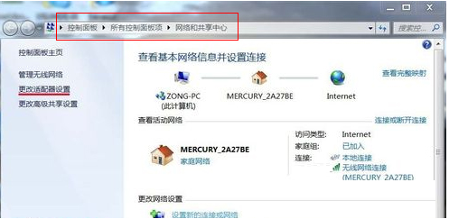 2、接着点击“网络和共享中心”然后再点击左侧的“更改适配器设置”。