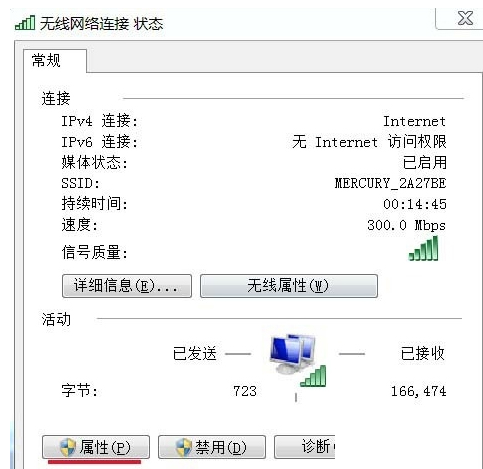 4、然后就会弹出“无线网络连接状态”窗口,单击“属性”。