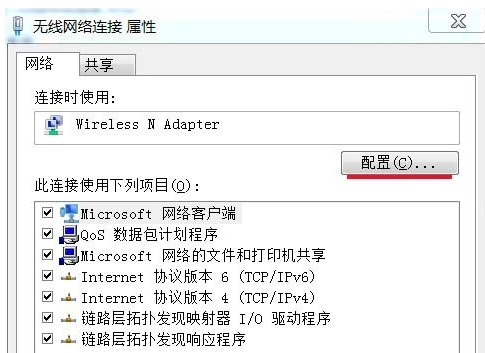 5、在弹出的“无线网络连接属性”窗口,单击“配置”。