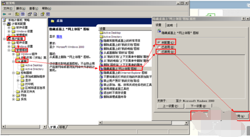 2、在组策略中依次点击用户配置-管理模板-桌面,然后在右侧列表中双击“暗藏桌面上“网络邻居”图标”,