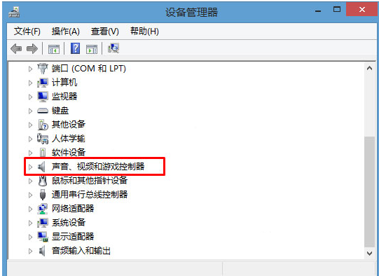 3、打开设备管理器,找到“声音、视频和游戏把持器”选项;