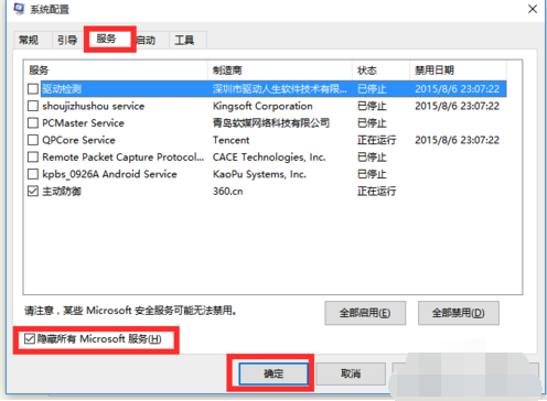 3、当系统重启完成后,再次进入“系统配置”界面,切换到“服务”选项卡,勾选“暗藏Windows服务”项, 同时勾选想要随系统自启动的项,点击“断定”即可完成。