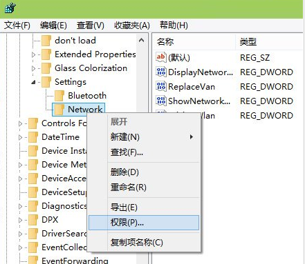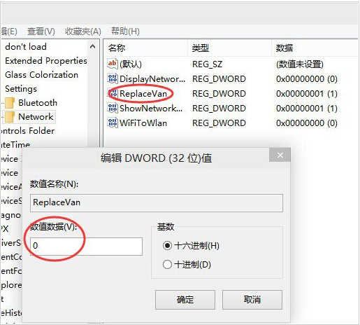 5、然后再注册表编辑器里的Network文件夹双击“ReplaceVan”,在弹出的窗口中将“数值数据”由默认的1改为0,单击“断定”退出。