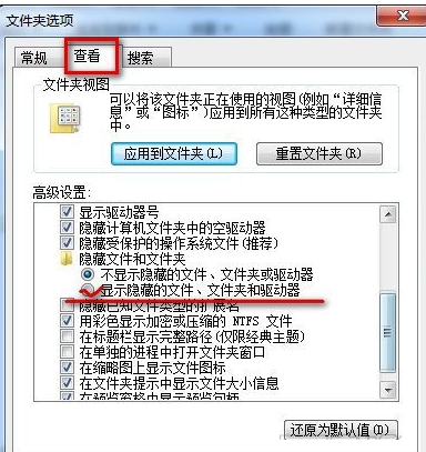 2、“查看”-“高级设置”-“显示暗藏的文件...”,点击利用,再点击断定
