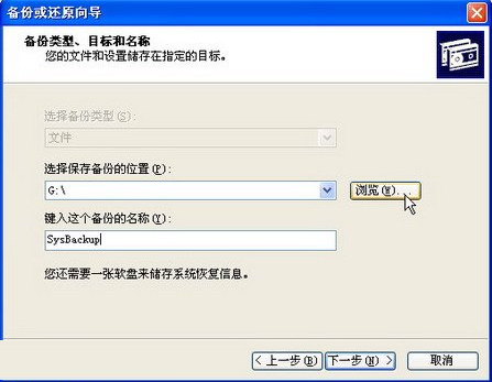 3、在打开的“备份类型、目标和名称”对话框中,单击“选择保存备份的地位”右侧的“浏览”按钮,找到一个合适的地位。在“输入这个备份的名称”编辑框中输入一个名称,如SysBackup。在软驱中插入一张空白软盘,并单击“下一步”按钮,