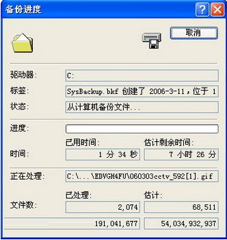 4、在打开的“正在完成备份或还原向导”对话框中单击“完成”按钮,经过系统主动保存卷信息和对需要保存的文件大小进行估计后,系统进入正式的备份状态。