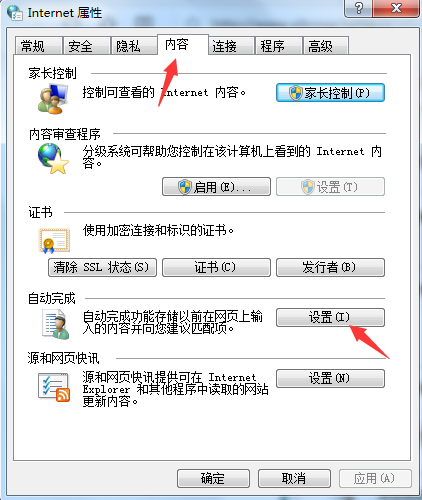 3、“Internet属性”窗口打开之后,就选中里面的“内容”选项卡,然后再点击“设置”选项;