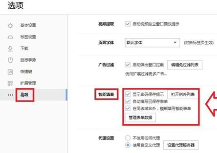 2、高级→智能填表→勾选需要的选项就能主动保存用户名和密码。