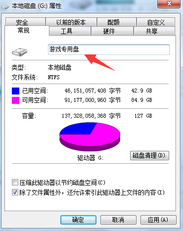 4、打开G盘的属性窗口中,可以看到名称一栏,在其中输入想要设置的个性化盘名(如:游戏专用盘)然后点击断定;