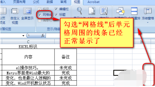 2、鼠标勾选“网格线”这是再看页面内的表格,会创造单元格周围的线条已经正常显示了。