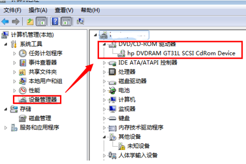 2、涌现的盘算机管理中找到“设备管理器”如下图,右边会列出当前电脑设备,其中就有DVD\cd驱动器