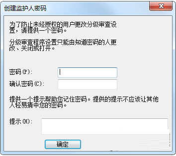 3、最后会弹出一个创立监护人密码的对话框,然后在上面设置审查程序的密码及密码提示信息材料。